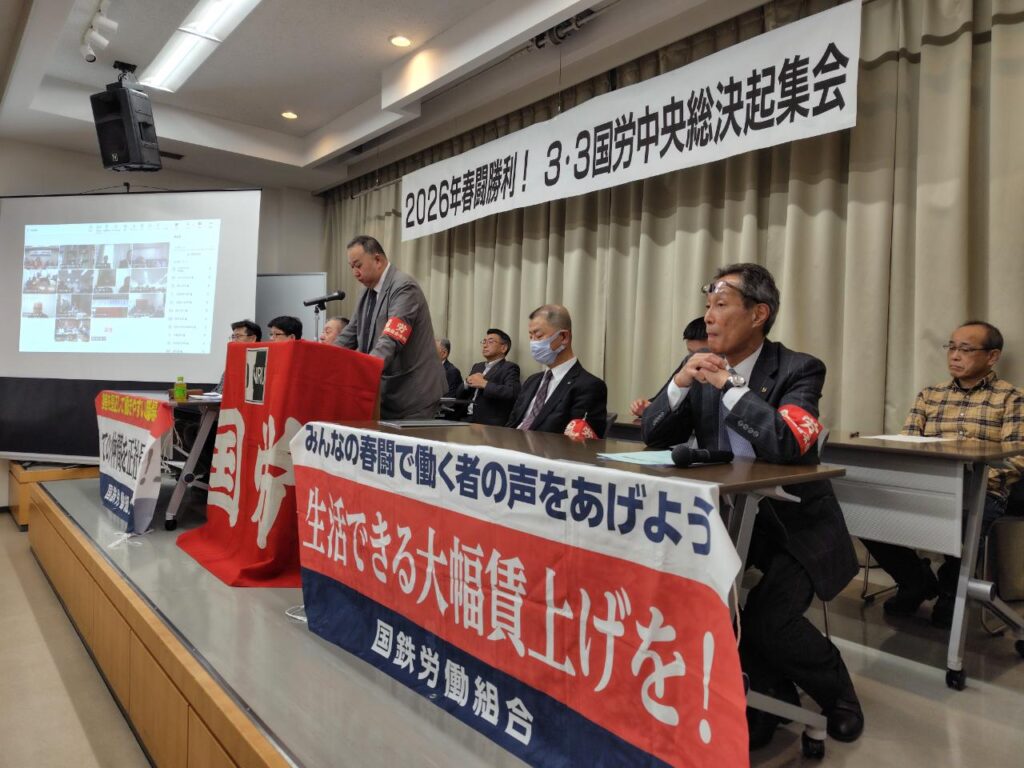 国労本部は3月3日に「2026春闘勝利!国労中央総行動」として東京都港区新橋の交通ビルにて、2026春闘勝利3・3国労中央総決起集会を開催しました。